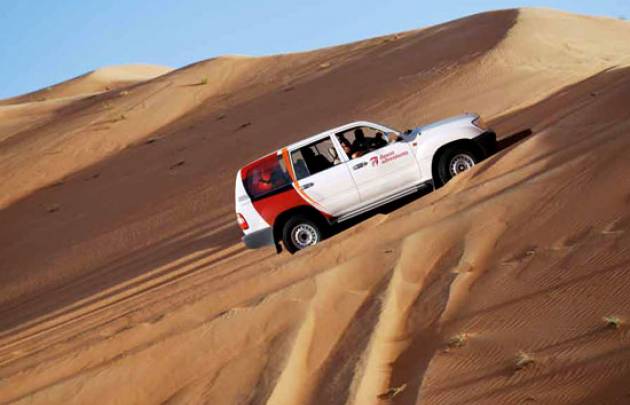 Am Nachmittag besteigen Sie einen Allradbetriebenen Jeep und starten eine spektakuläre und abenteuerliche Fahrt durch die Wüste. Das Auf und Ab in den goldenen Sanddünen ist atemberaubend und das wunderschöne Naturschauspiel des Sandes unvergesslich. Soweit das Auge reicht ist nichts als Sand und Dünenmeer in allen Farb- und Formschattierungen zu sehen. In einzigartiger Stille beobachten Sie, wie die Sonne kupferrot hinter den Dünen versinkt. In der Abenddämmerung erreichen wir unser Beduinencamp und Sie haben Gelegenheit, sich im Kamelreiten zu üben oder Sandboard zu fahren während ein köstliches BBQ über offenem Feuer für Sie zubereitet wird. Arabische Teppiche laden zum Verweilen ein, traditionelles Ambiente und eine Bauchtänzerin sorgen für eine unvergessliche und stimmungsvolle Atmosphäre. (6 Personen pro Jeep)