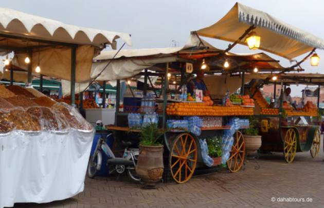 Heute erwartet Sie ein herrlich erlebnisreicher Tag in der Roten Königsstadt und "Perle des Südens". Sie besichtigen die berühmten Saaditengräber, die bezaubernden Menara Gärten, die prachtvolle Koutoubia-Mosche und den Bahia Palast. Sie tauchen ein in den farbenfrohen und veführerischen Souk von Marrakesch und besuchen den faszinierenden Djemaa el Fna Platz mit seiner urtypischen orientalischen Atmosphäre voll fliegender Händler, Märchenerzähler und Schlangenbeschwörer. Abendessen und Übernachtung im Hotel.